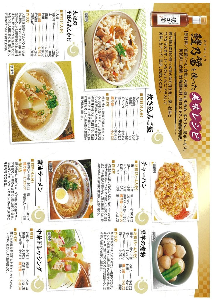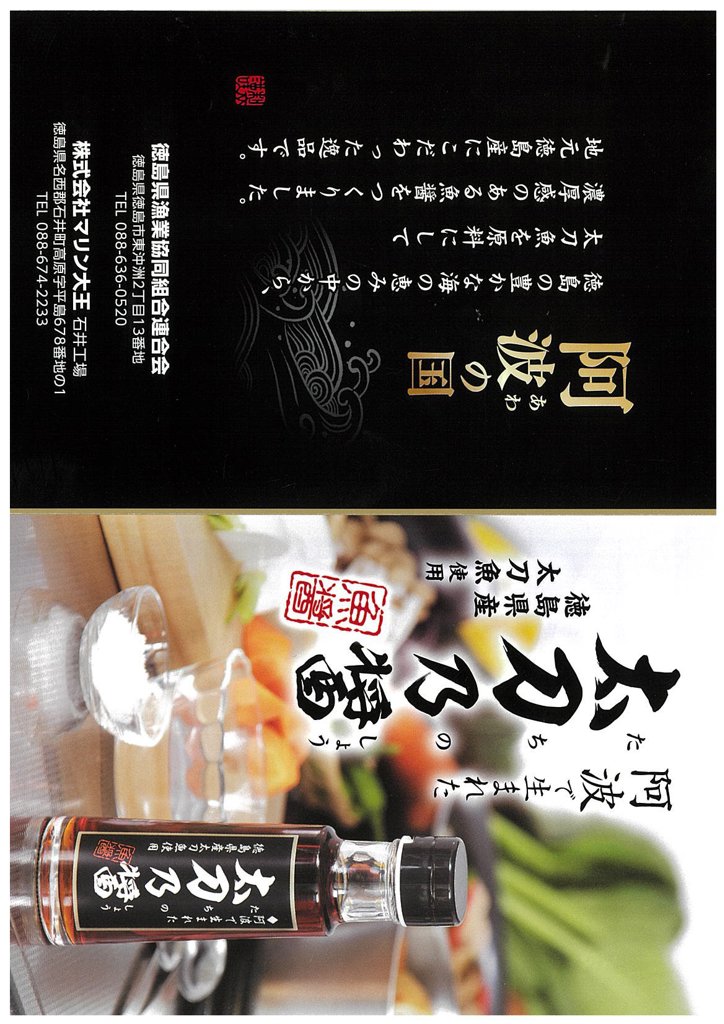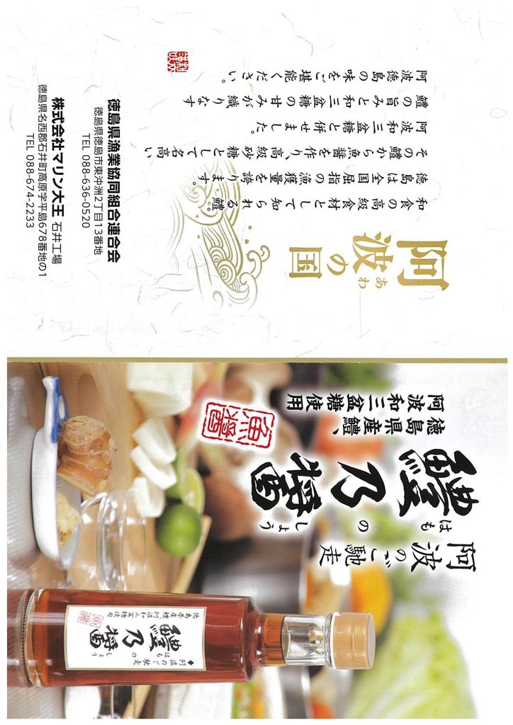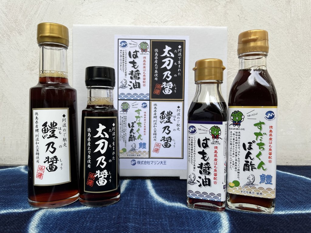 【はも醤油】しょうゆ(国内製造)、魚醤加工品(魚醤(徳島県製造)、砂糖、こんぶエキス、食塩、米発酵調味料、還元水あめ、発酵調味料)、食塩/アルコール、調味料(アミノ酸等)、(一部に小麦・大豆を含む) 【はもポン酢】しょうゆ(国内製造)、すだち果汁、魚醤(徳島県製造)、砂糖、醸造酢、米発酵調味料、こんぶエキス、食塩、酵母エキス、(一部に小麦・大豆を含む) 【太刀乃醤】タチウオ(徳島県産)、食塩、米麹 【鱧乃醤】ハモ(徳島県産)、還元水あめ、食塩、本みりん、米麹、昆布エキス、阿波和三盆糖、酒精調味料、酵母エキス、発酵酸味液 |